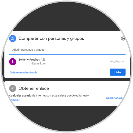 Allí podemos ingresar la cuenta de Google con la cual se va a compartir el archivo. Una vez este el correo damos clic en Enviar.