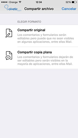 Nos van a preguntar si queremos compartir el texto original en el cual los comentarios y formularios serán editables pero es posible que no sean visibles en algunas apps, como el Mail, o por el contrario compartir en copia plana, en donde los comentarios y formularios dejaran de ser editables pero serán visibles en la mayoría de apps.