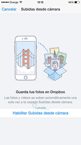 Si lo que queremos hacer es copiar la galería de nuestro teléfono por completo a Dropbox, debemos dirigirnos a la app. Situarnos e el icono donde dice “Fotos” y continuación “Habilitar subida desde cámara”