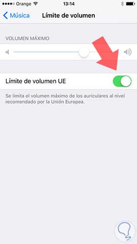 En la siguiente pantalla aparecerá la opción de poner el “Limite de la Unión Europea”, por el cual veremos que nuestro volumen máximo se reduce, ya que esta opción contempla que el volumen máximos de nuestro auriculares, no podrá exceder el nivel recomendad por la UE
