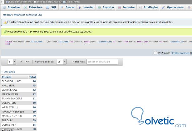 Select CONCAT(customer.first_name,' ',customer.last_name) as Cliente, count(rental.customer_id) as Total from rental inner join customer on rental.customer_id=customer.customer_id group by rental.customer_id ***** by total descAsí podremos hacer muchas pruebas con MySQL para testear rendimiento. En otro tutorial avanzaremos en consultas mas complejas.