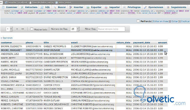 Para generar este listado, deberemos buscar en la tabla del rental las películas con una fecha de regreso que es NULL osea sin fecha y que la fecha de alquiler supere el tiempo o cantidad de días establecidos que puede conservar el cliente la película. Si se cumple esta condición, entonces el cliente esta adeudando la película y se deberá mostrar en el listado el nombre de la película junto con el nombre del cliente, número de teléfono y email. También mostraremos si la película esta pagada, en que fecha se pago y cuanto se pago.