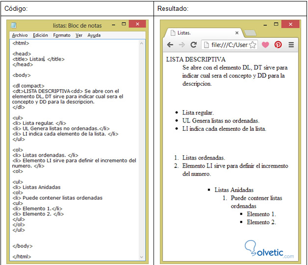 - Listas: Existen tres tipos de listas. Descriptiva, Regulares y Anidadas. Generar archivo listas.html