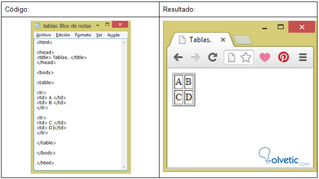 - Tablas: Se establece entre las marcas <TABLE> y </TABLE> anteriormente se utilizaban para dar la estructura a toda la página web. Fueron reemplazadas por el elemento <DIV> que es más flexible. La etiqueta <tr> genera un renglón para la tabla y <td> genera una celda. Generar archivo tablas.html