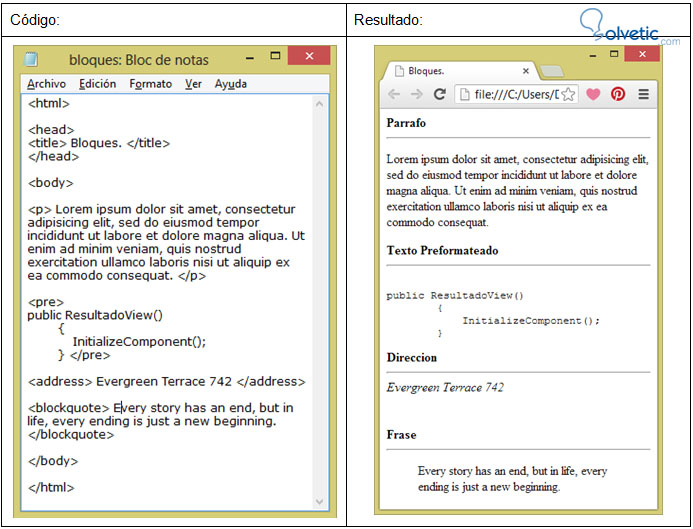 - Bloques: Esta etiqueta se utiliza para separar párrafos, texto preformateado, bloques como frases o direcciones. Crear archivo bloques.html