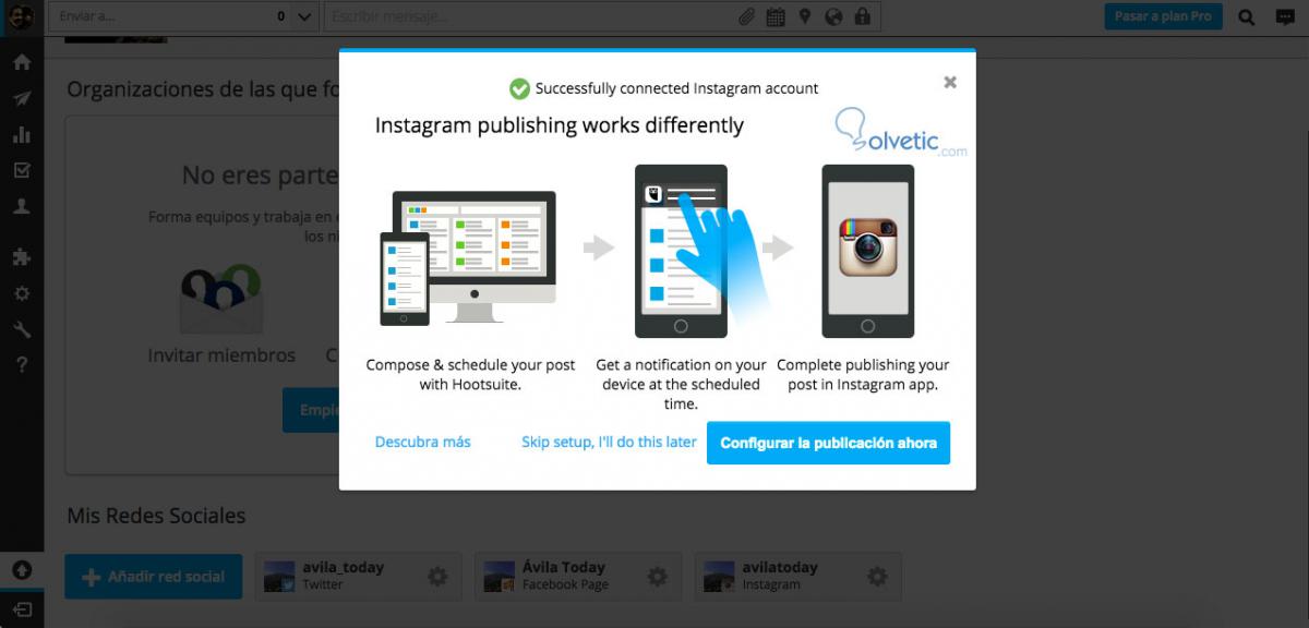 Lo que explica es que con Instagram, Hootsuite no se encarga de realizar la publicación directamente en tu cuenta, como sucede con las demás redes sociales. Lo que hace es que, si tienes en tu móvil descargada la aplicación de Hootsuite, esta te enviará una notificación en el día y hora que hayas seleccionado para que recuerdes publicar. Si bien es una ayuda, no es tan eficaz como lo que permite hacer con las demás redes sociales.