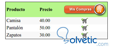 El resultado de ejecutar en un navegador será la pantalla anterior:A continuación crearemos el archivo agregarcompra.php que sera el que reibe el link con el id del producto y lo añade al carrito mediante la sesion y el array.