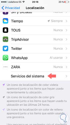 Lo primero que tenemos que hacer para que las ubicaciones frecuentes queden desactivadas, es dirigirnos a "Ajustes" - "Privacidad" y después pulsamos en “Localización”. Baja hasta la parte inferior y pincha en "Servicios del sistema".