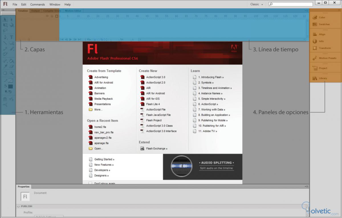Estas son de una forma breve las propiedades generales de Flash CS6, al ser conscientes de las características de la interfaz de la aplicación, función de las herramientas, conocimiento de las áreas de capas / línea de tiempo y las opciones que podemos configurar a través de los paneles estamos preparados para empezar con nuestro primer proyecto de Flash CS6.