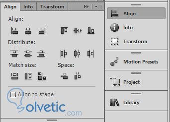 3. Panel Alinear: Sirve para alinear los objetos con respecto al espacio de trabajo u otros elementos. También es posible modificar elementos para que sean iguales en ancho y alto a otros elemento presente en el espacio de trabajo.