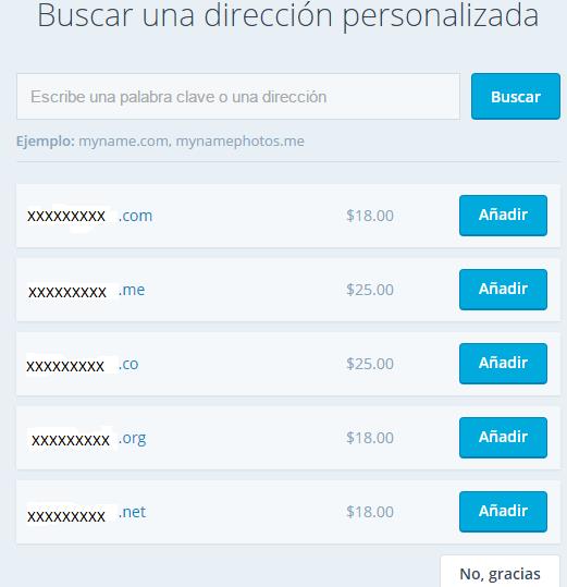Ahora, si estás pensando en una página web como tal, las opciones para dominios web son amplia con WP ya que vas a tener al menos 5 alternativas para elegir entre las cuales están los dominios con diversos precios: