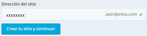 c. Si el nombre de tu sitio Web es aceptado verás una confirmación por parte de la página de WP (ver ilustración abajo); si estás de acuerdo puedes continuar con el proceso; da clic en “Crear tu Sitio y continuar”.