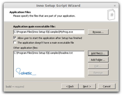 Continuando solicitara especificar el fichero ejecutable exe o jar si fuese java o la extensión de nuestro ejecutable y añadir todas las dependencias necesarias para nuestra aplicaciòn como ser fichero, imagenes, bases de datos en caso de ser empotradas o sql si la vamos a crear en la instalación.