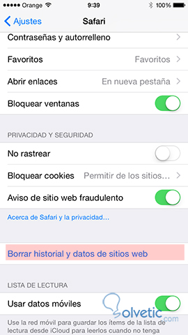 Una vez que estemos dentro de “Safari” tenemos que desplazarnos hacia abajo hasta que encontremos la opción que pone “Borrar historia y los datos de los sitios web”