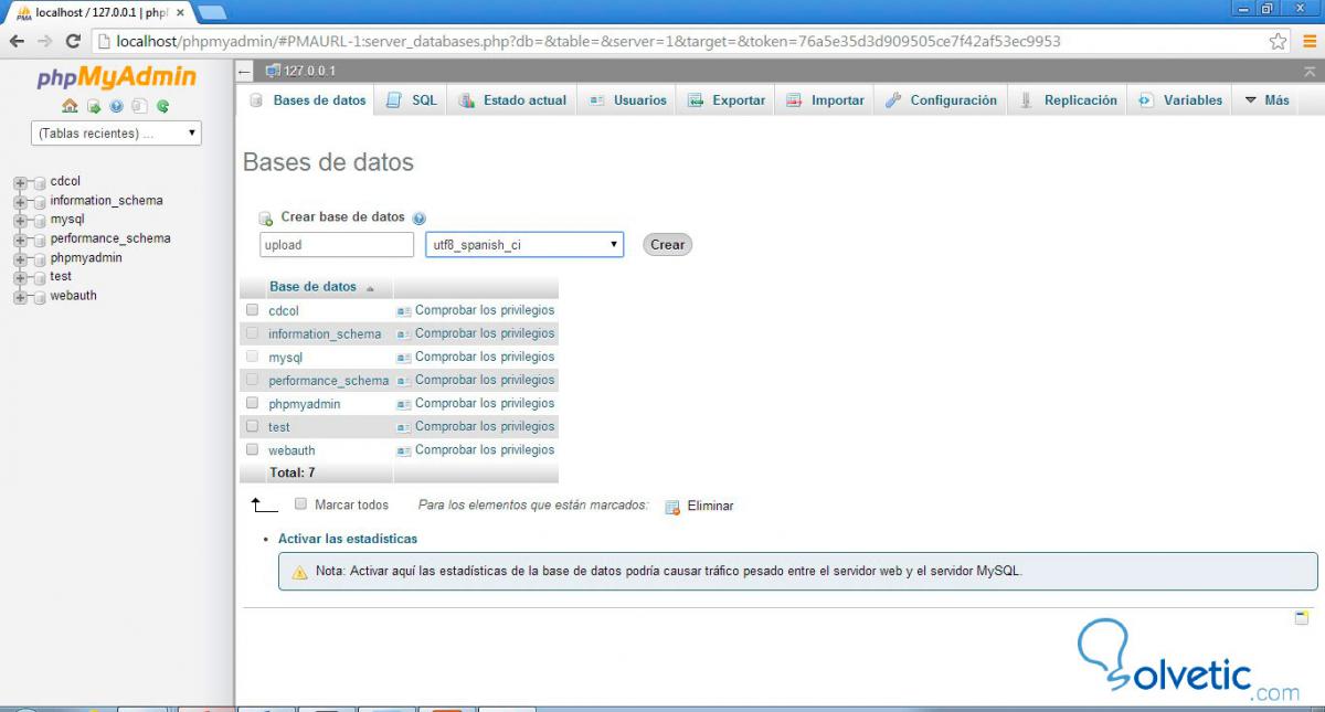 Con el xampp activo nos vamos a nuestro navegador e ingresamos la dirección “localhost/phpmyadmin” una vez que ingresamos con nuestro usuario y contraseña procederemos a crear una nueva base de datos, yo la llamare “upload” y le asignare un cotejamiento “utf8_spanish_ci”.