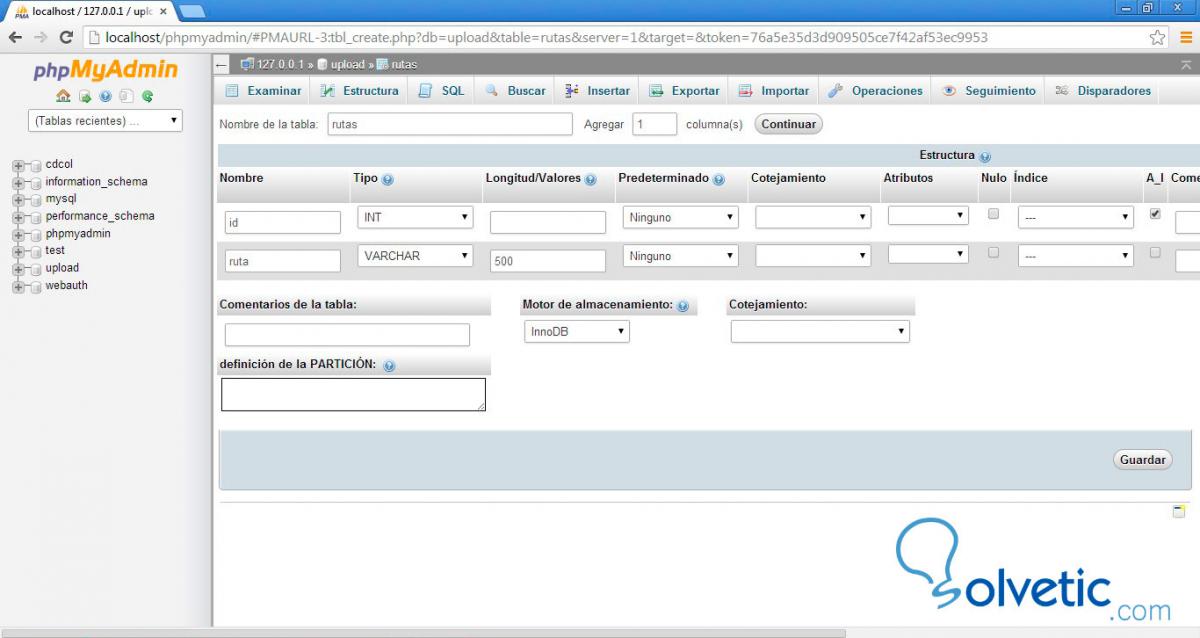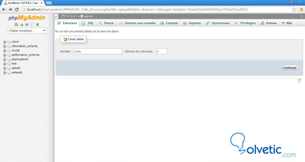 Dentro crearemos una tabla a la que llamare “rutas” con solo 2 columnas, un id auto incrementable y otra llamada ruta de tipo varchar.