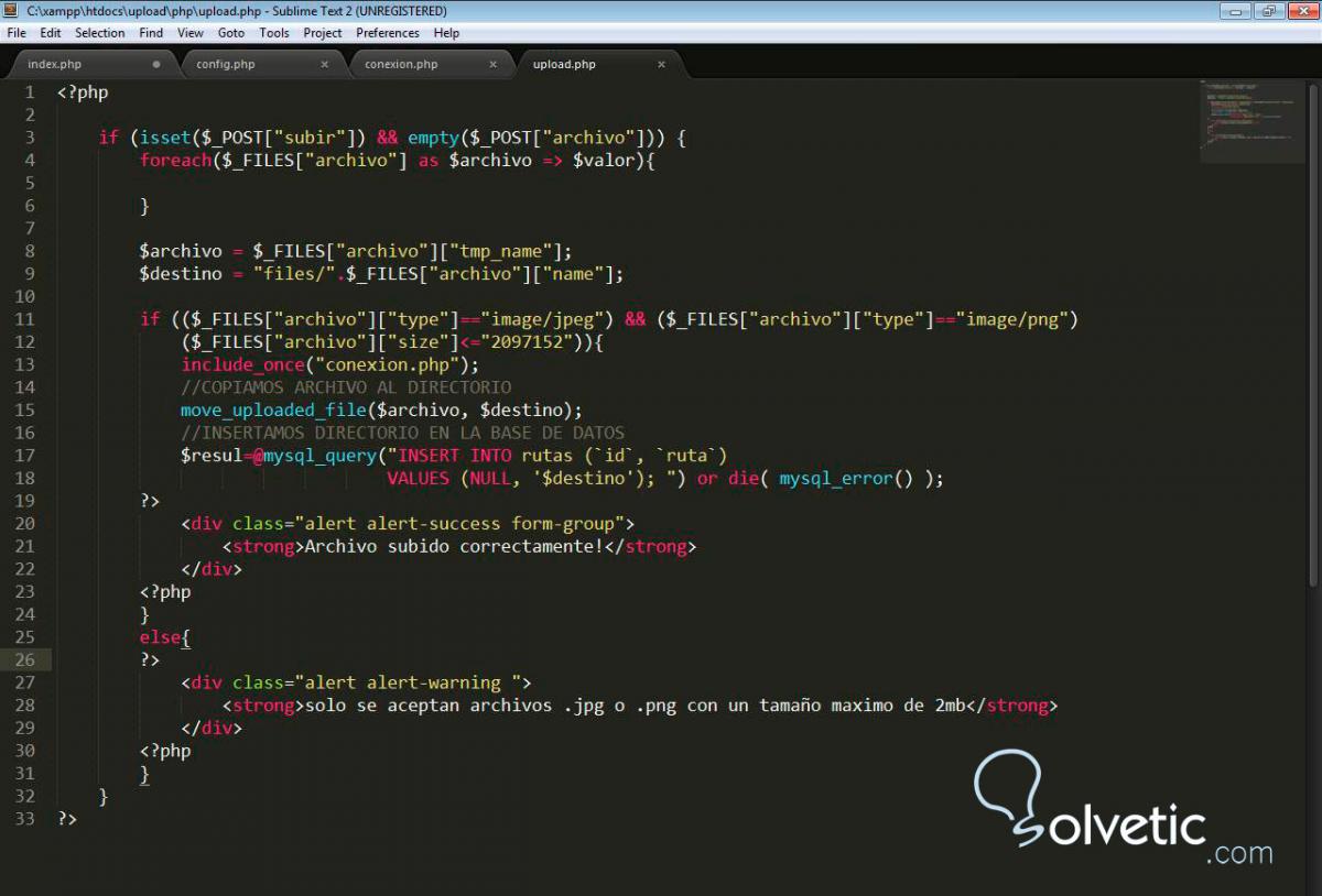 Luego añadiremos la función para que el archivo que subamos sea copiado al directorio “files” e insertaremos en la base de datos la ruta o enlace a este archivo. Luego podemos añadir un mensaje de confirmación si todo va bien y un mensaje de advertencia en caso de que no estemos subiendo el tipo de archivo adecuado o este supere el límite máximo de MB.