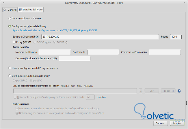 Desde la Configuración Manual podemos asignar la dirección IP o el nombre del proxy y el número de puerto.