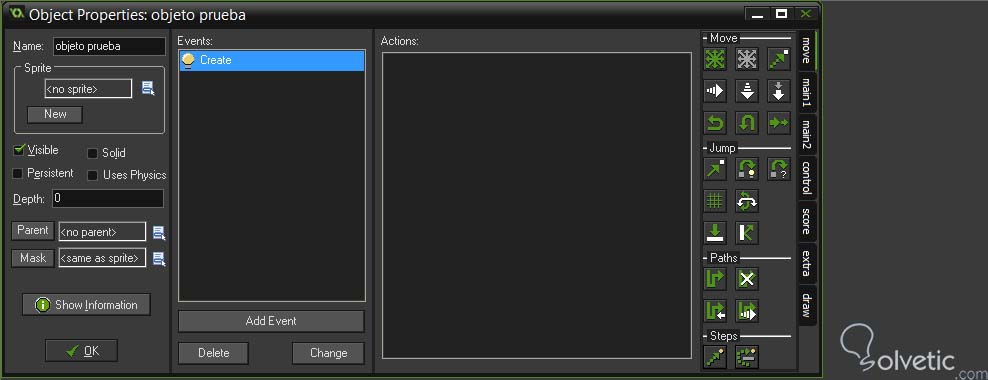 Dentro de un objeto existen eventos asociados al mismo, donde estos eventos pueden contener un script o contener una acción que llame a uno de estos. Esta será la única ocasión donde la funcionalidad de Arrastrar y Soltar será utilizada para los scripts.