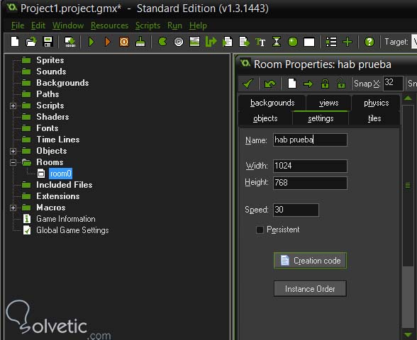 Estas rooms o habitaciones también pueden contener scripts, para ello cuando estamos editando una habitación nos dirigimos a la pestaña de ajustes dentro de las propiedades de la habitación y allí deberíamos ver el botón de Creación de Código: