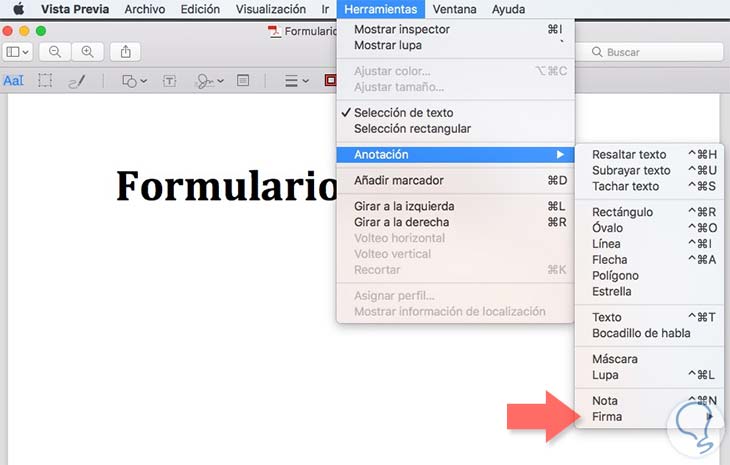 Lo siguiente que debemos hacer es dirigirnos al menú superior y seleccionar “Herramientas”- “Anotación”- “Firma”- “Gestionar firma”