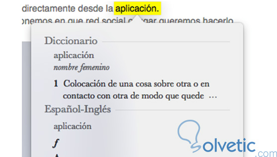 Se abrirá una nueva ventana en la que podremos seleccionar diferentes opciones tales como usar la Wikipedia, español-ingles, buscar en Apple o todos.