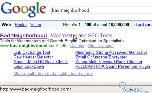 Por ejemplo: se busca la frase bad neighborhood (barrio malo) y aparece un sitio que brinda herramientas para Webmasters: