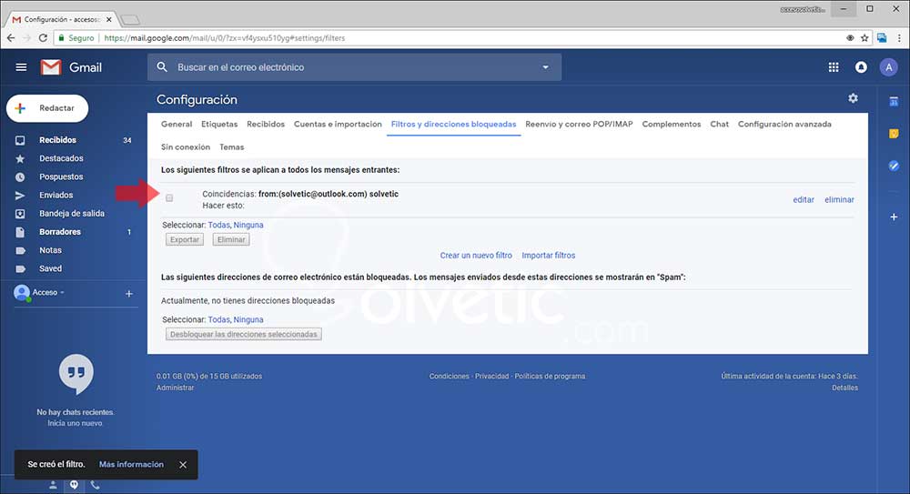 Pulsamos en el botón Crear filtro y veremos que se creara dicho filtro de forma correcta. Así, cada vez que se reciba u correo con los criterios indicados se enviara la respuesta estándar.