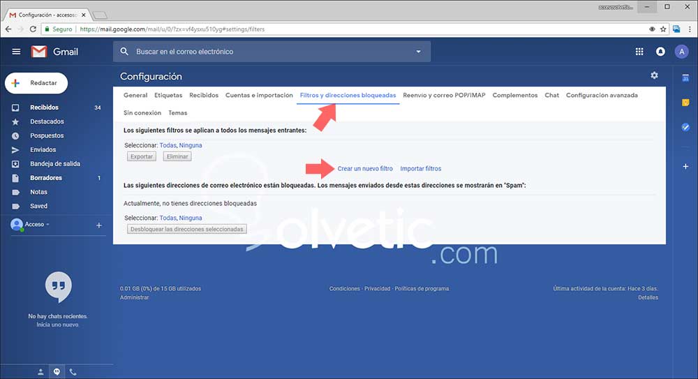 Este tipo de respuestas estándar se pueden convertir en una auto-respuesta de Gmail para simplificar determinadas acciones en el correo, si este es el caso, vamos de nuevo a Configuración y esta vez vamos a la sección Filtros y direcciones bloqueadas y allí damos clic en la línea Crear un nuevo filtro ubicada en la parte inferior: