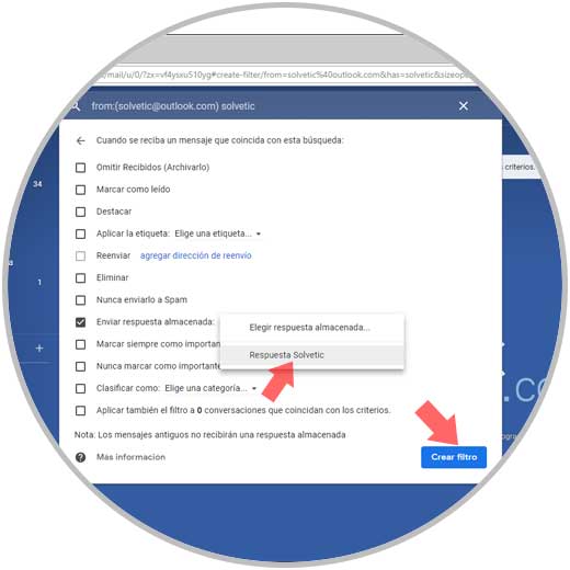 Definido esto, pulsamos en la línea Crear filtro y en la ventana desplegada activamos la casilla Enviar respuesta almacenada y en el costado lateral seleccionamos la respuesta deseada: