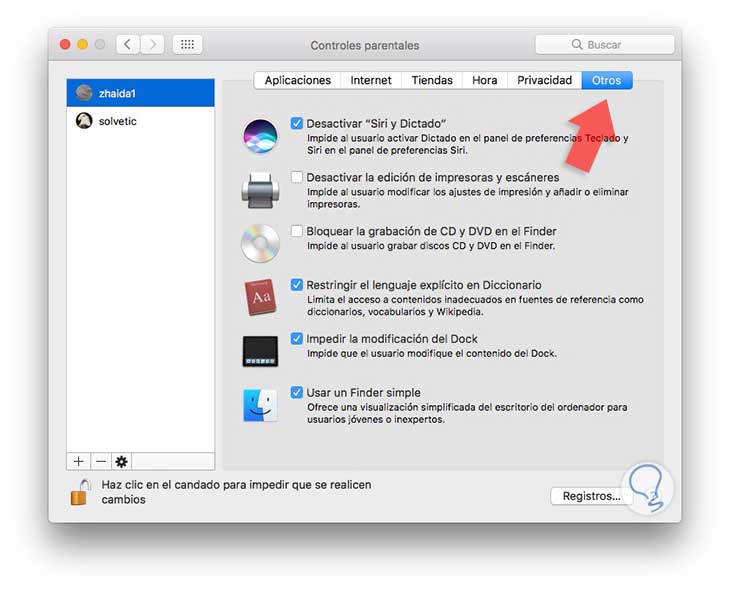 En el apartado de otros, podemos gestionar diferentes características que tiene nuestro ordenador como Siri,el diccionario, impresora, el cambio en el Dock, la grabación de CD O DVD o la usabilidad del Finder. Es una opción sobretodo cuando son muy pequeños, y únicamente queremos que lo utilicen para buscar información del colegio o para algún juego educativo