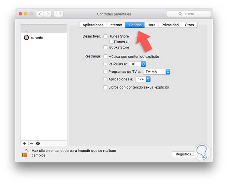 En la opción de tiendas tenemos la posibilidad de desactivar las compras en el App Store y establecer una serie de restricciones en cuanto a música, películas, programas de televisión, aplicaciones o libros de contenido sexual.