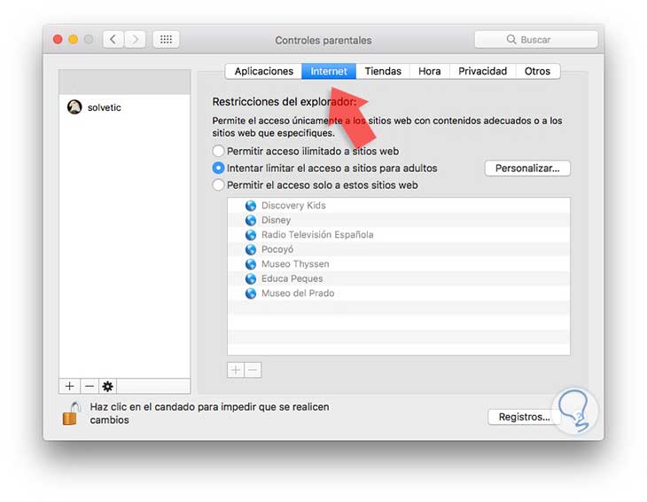 El siguiente apartado que vamos a poder configurar es el de internet. Aquí podemos seleccionar que tipo de acceso queremos que tenga a internet. Podemos limitar el acceso a sitios web para adultos automáticamente, o directamente realizar una lista con los sitios web a los que se puede acceder.
