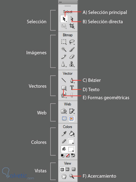 La barra de herramientas está dividida en 3 secciones: Sección de herramientas de selección, sección de herramientas de imágenes, sección para crear objetos vectoriales y la sección de herramientas web. Cubriremos las opciones básicas las cuales serán suficientes para poder utilizar la aplicación.
