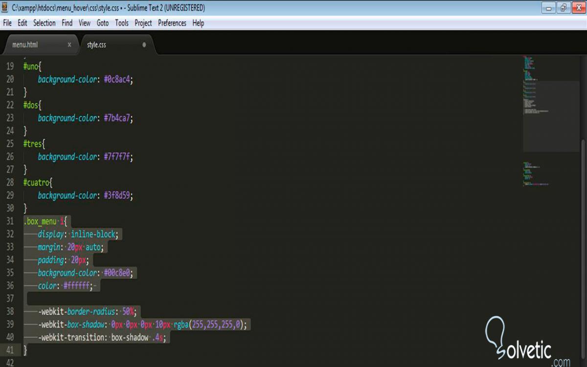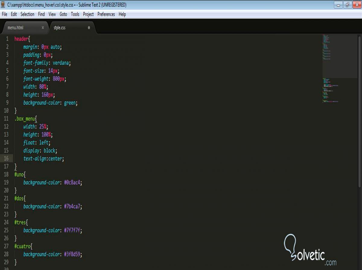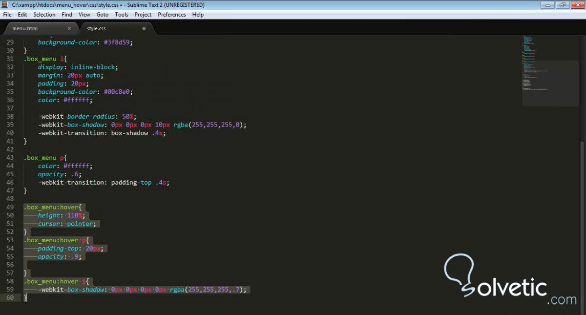 Ahora modificare un poco el archivo css para completar el efecto, comenzare por modificar la clase “box_menu” alineando el texto al centro y dándole un display=”block”;