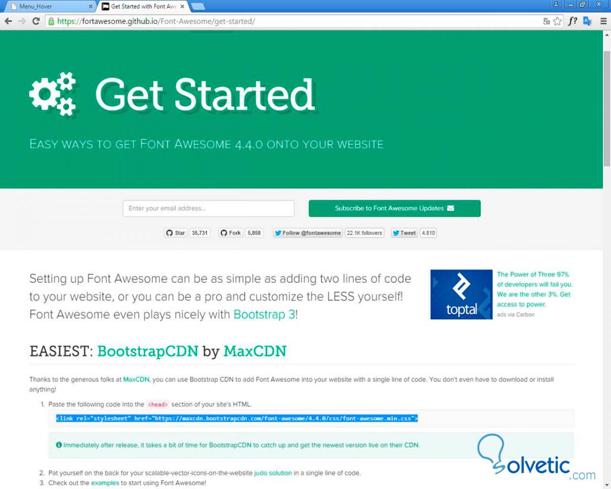 Bien volvamos al documento “menu.html” tal cual como lo dejamos en el paso 4, ahora procederemos a agregar los iconos y el texto que tendrá nuestro menú para esto no vamos a utilizar imágenes sino que nos vamos a ayudar un poco con bootstrap y usaremos iconos del paquete “Font Awesome”, para esto vamos al navegador y accedemos a la web https://fortawesome....o/Font-Awesome/hacemos click en el menú “Get started” y bajamos a la sección “EASIEST: BootstrapCDN by MaxCDN”.