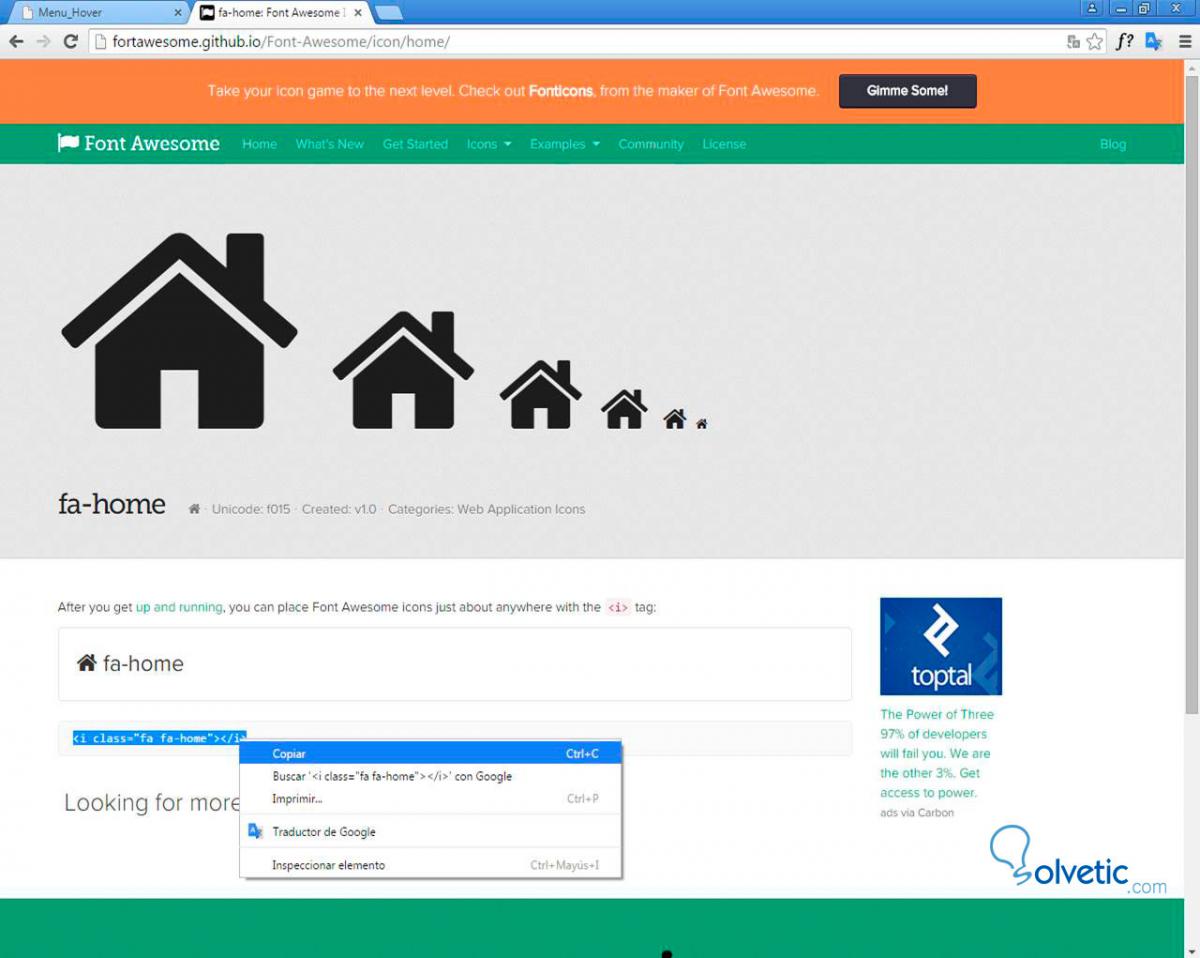 Al hacer click nos llevara a otra ventana en la cual podremos ver el código para insertar ese icono a nuestro diseño.