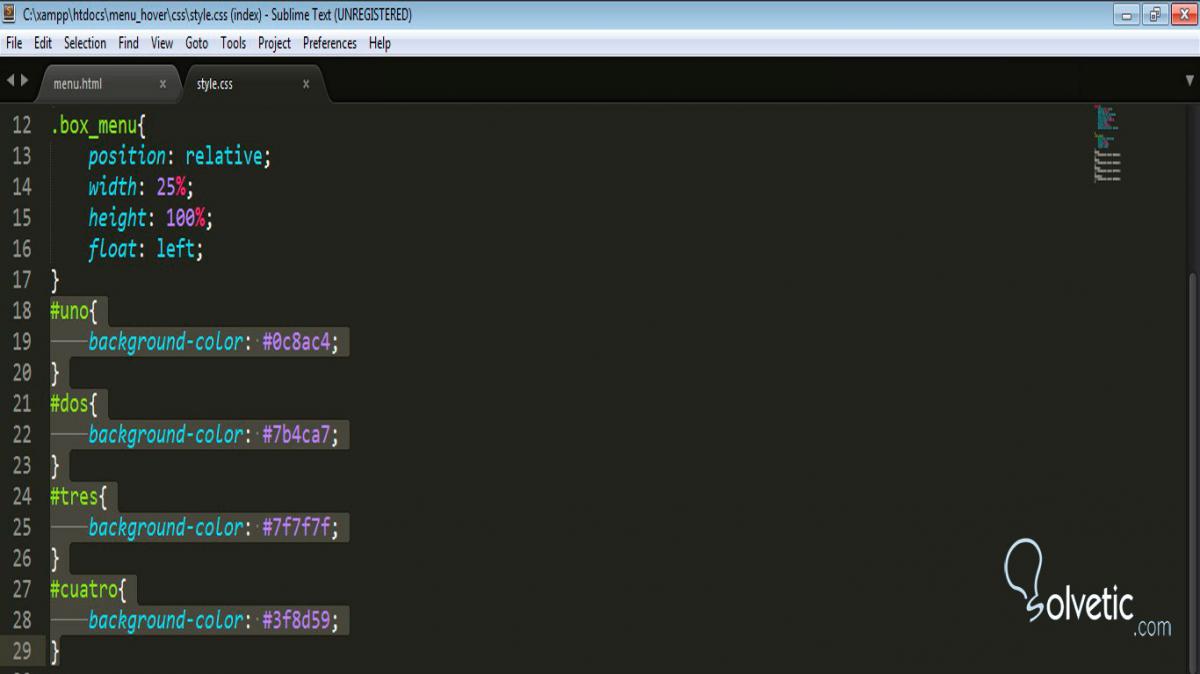 En nuestro archivo style.css añadiremos las propiedades para la clase “box_menu” y para las capas “uno, dos, tres y cuatro”.