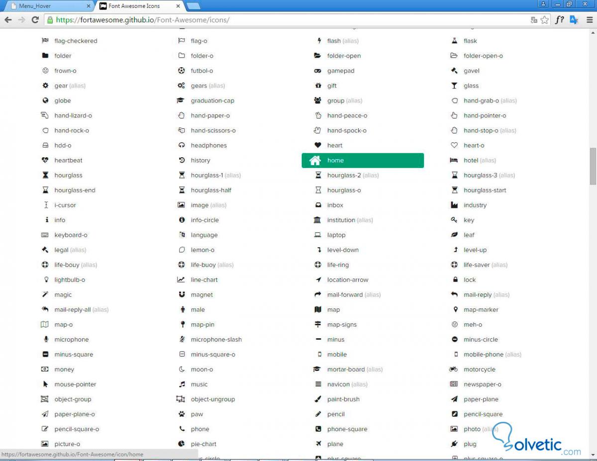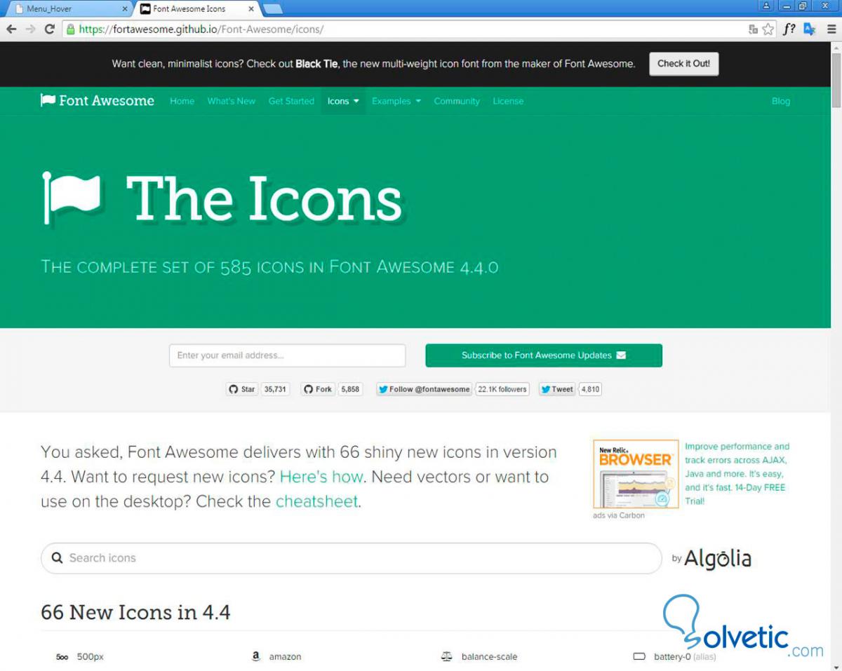 Con esto ya podemos usar los iconos de Font Awesome en nuestro diseño, pero ahora tenemos que escoger cuales iconos vamos a colocar, para esto volvemos a su sitio web y ubicamos el menú “Icons”.