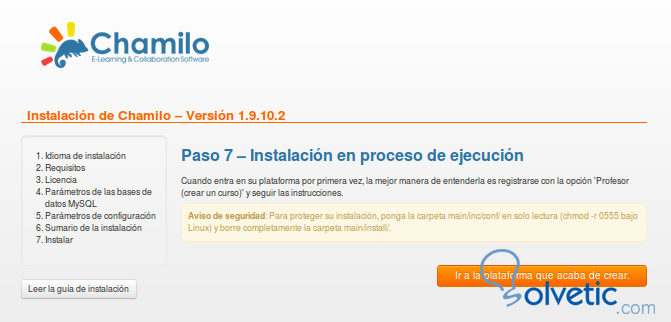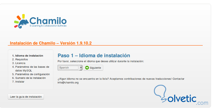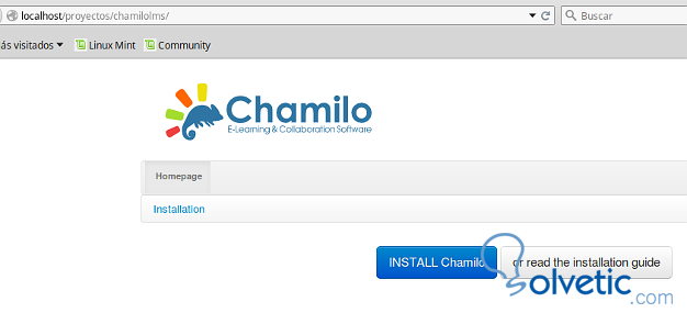 Sudo chmod -R 777 chamilolms Sudo chown -R miusuario:miusuario chamilolmsLuego desde cualquier navegador accedemos al proyecto, con la url de nuestro servidor local, en este caso: