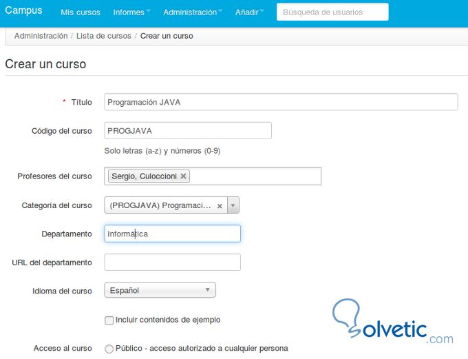 A continuación vamos a Crear Curso y completamos los datos de: