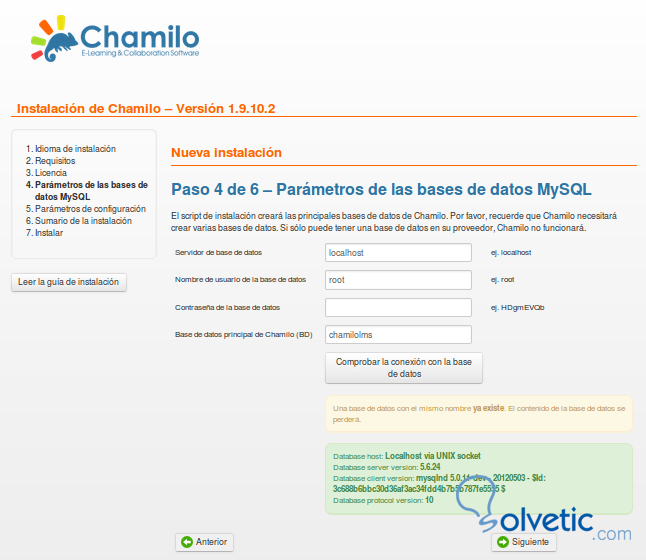 A continuación debemos configurar la base de datos que habíamos creado se llama chamilolms.