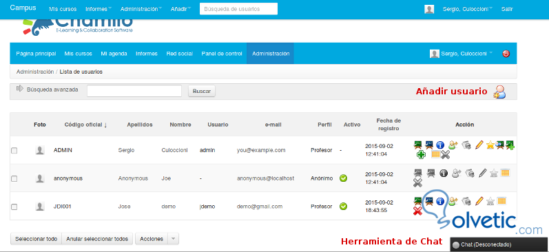 Abrimos la lista de usuarios y veremos el listado, el icono para añadir usuarios y una herramienta de chat para hablar con cualquier usuario. Añadimos aquí un usuario con perfil profesor.