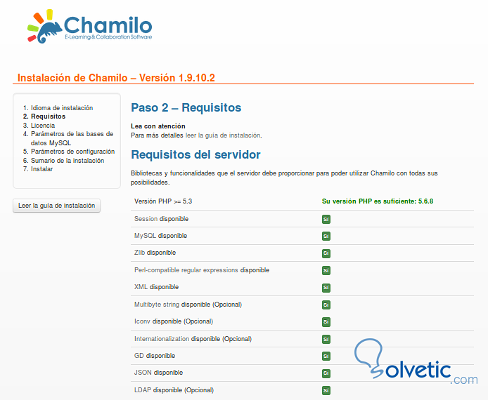 Luego hacemos clic en Siguiente y la plataforma realizará un chequeo de requisitos en el servidor para detectar si tenemos todas las dependencias y permisos necesarios.