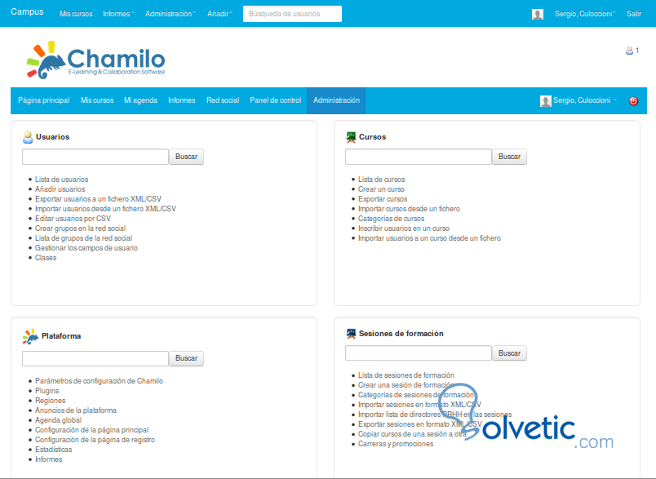 Veamos a continuación el Panel principal de Administración para gestionar Chamilo.
