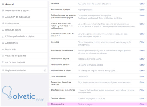 Si hemos decidido que lo que queremos es borrarla porque no está dando los resultados esperados, o ya hemos dejado de tener ese negocio, empresa etc, tenemos que dirigirnos la “Configuración” de nuestra página y en la sección de “General” en la última pestaña del menú podemos encontrar “Eliminar página”