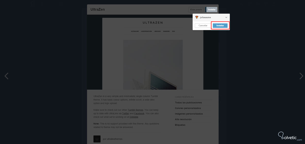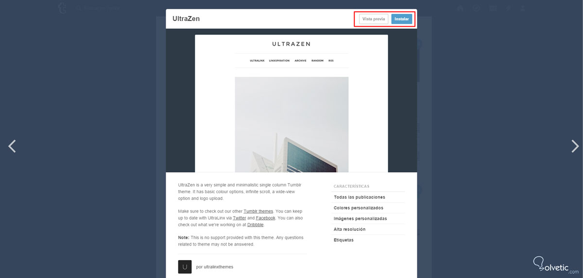 Cuando veas uno que te llame la atención, haz clic sobre él y verás un preview como este, en donde puedes escoger seguir explorando haciendo clic fuera de la ventana, para ver otros temas. También puedes probar cómo se vería el tema en tu blog haciendo clic sobre “Vista previa”, o decidir aplicarlo definitivamente, haciendo clic en “Instalar” (siempre que quieras vas a poder cambiar el tema de tu blog de Tumblr, así que no te asustes al escoger alguno):