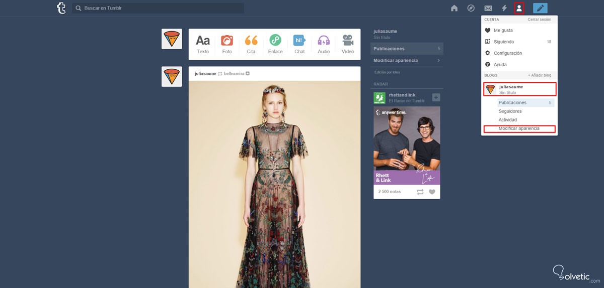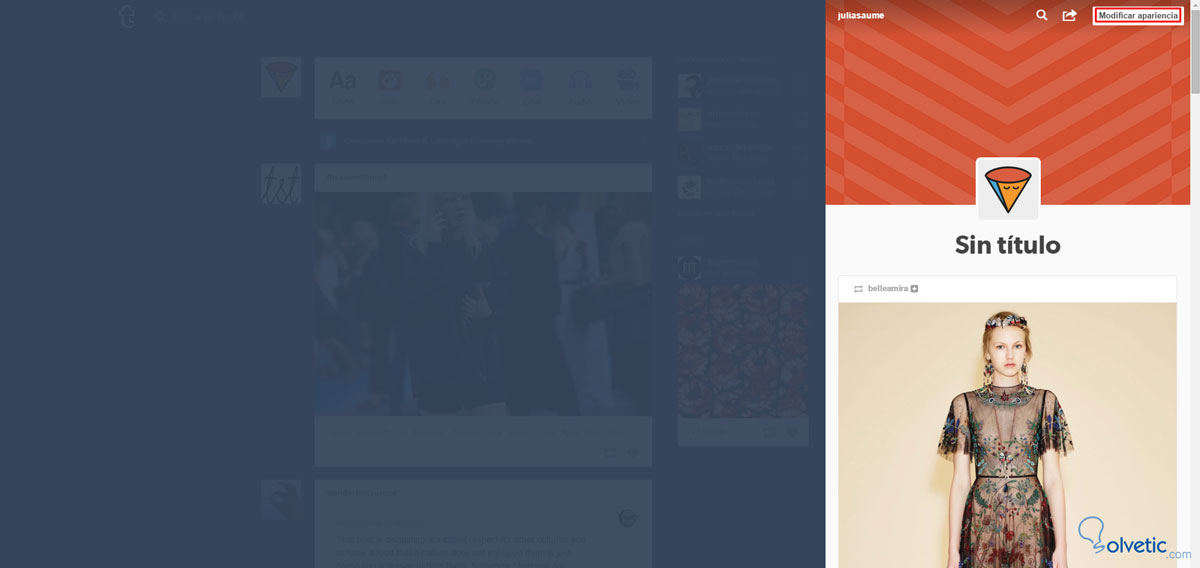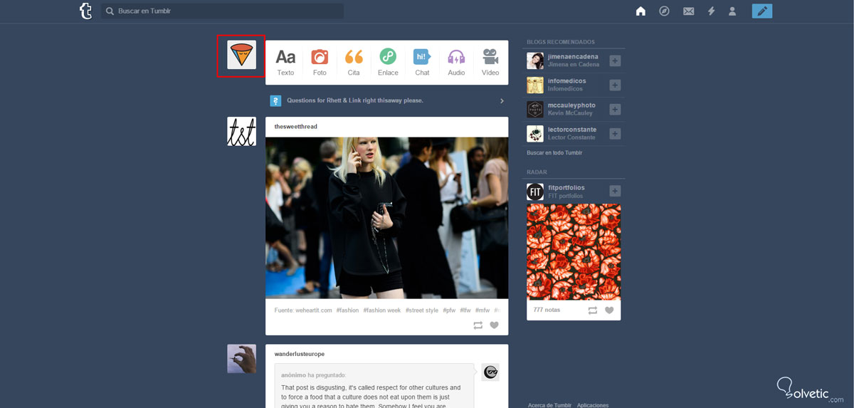 Para cambiar la apariencia de tu Tumblr, haz clic en tu Avatar, que se encuentra a la izquierda del río de posts de los blogs que sigues: