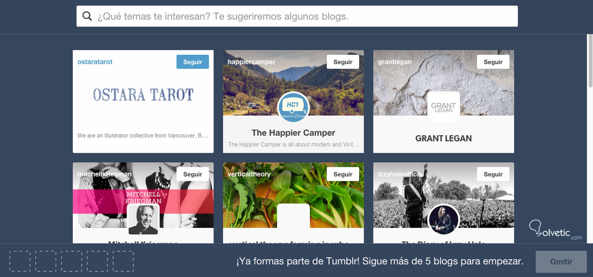 Al crear la cuenta Tumblr te pedirá que sigas a más de 5 blogs. Puedes hacerlo en ese momento, o puedes omitir este paso; pero para que tu “Escritorio” o “Dashboard” tenga algo cuando entres, te recomiendo que procedas a seguir algunos blogs. Para hacer esto, puedes seguir los que te sugiere Tumblr o puedes hacer una búsqueda de temas de tu interés en la barra superior y seguir los blogs que encuentres allí.
