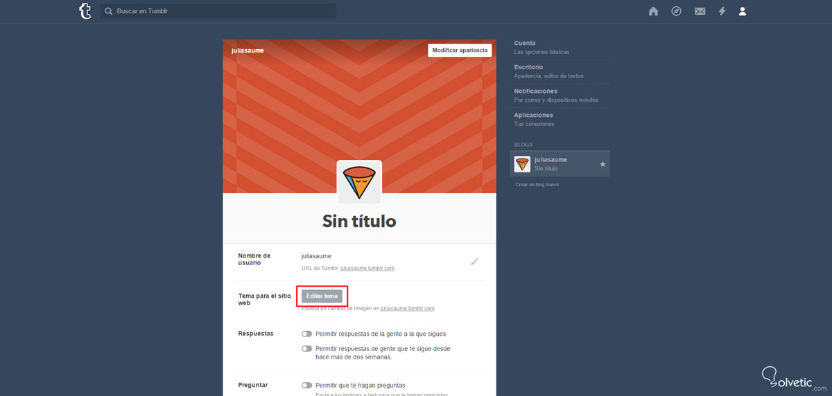 Una vez lo escojas, podrás personalizarlo aún más con opciones de edición HTML, paletas de color diferentes, páginas, estilos de letra e imágenes propias. Simplemente haz clic sobre “Editar tema” y sigue cambiando detalles como el título, subtítulo, avatar, fondo, etc.: